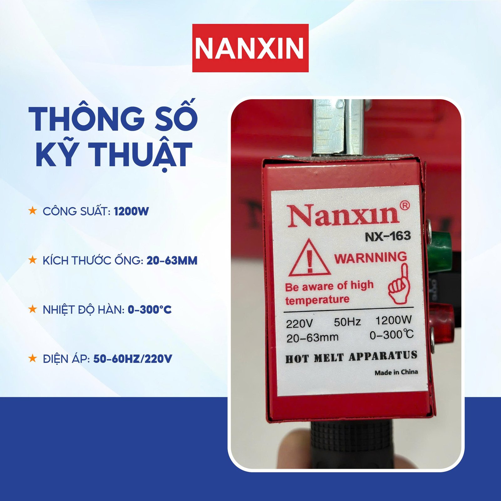 Máy hàn nhiệt Nanxin 163 được thiết kế với những thông số kỹ thuật tối ưu, đáp ứng hầu hết nhu cầu trong thi công ống nhựa: