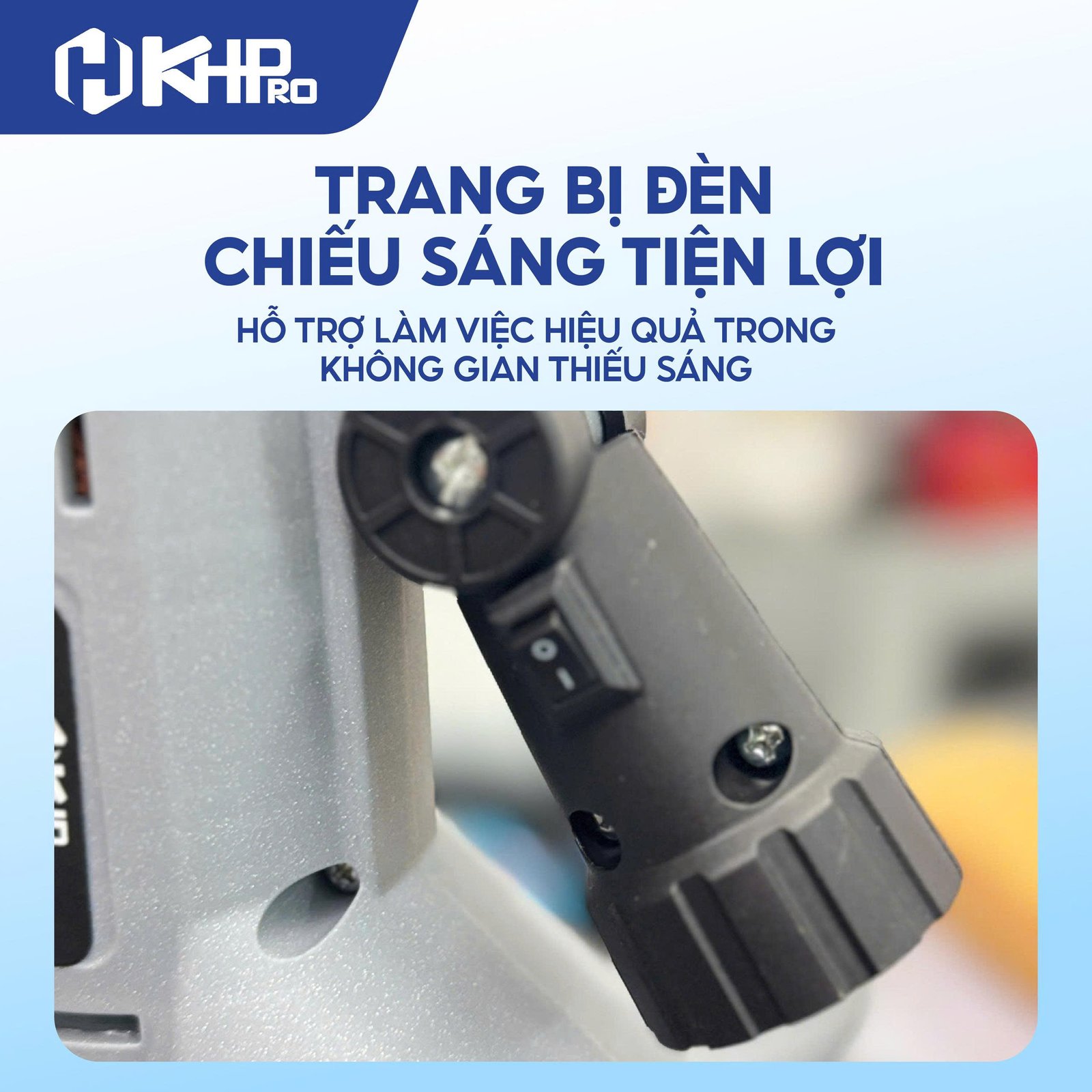 Một điểm cộng lớn của máy xoa vữa KHPRO KH-3801 chính là hệ thống đèn chiếu sáng tích hợp sẵn. Tính năng này hỗ trợ người thợ thi công trong các khu vực thiếu ánh sáng hoặc khi cần làm việc vào buổi tối. Đèn được bố trí khoa học, không gây chói mắt nhưng đủ để làm rõ từng chi tiết trên bề mặt tường, giúp quá trình hoàn thiện trở nên chính xác và an toàn hơn.
