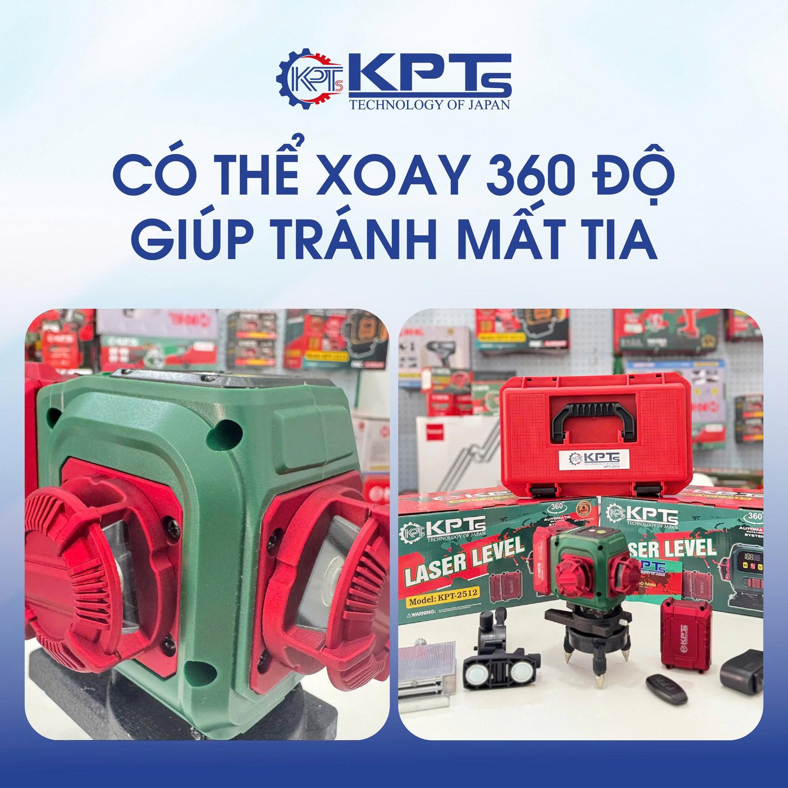 Máy bắn laser KPT-12 có cơ chế cân bằng tự động, có thể hoạt động 360° phục vụ cho mọi yêu cầu công việc với độ chính xác tuyệt đối.