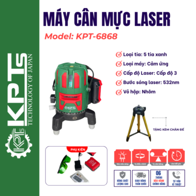Máy cân mực Laser KPTs KPT-6868 là loại máy cảm ứng 5 tia xanh với 1 tia ngang, 4 tia đứng và 1 dọi tâm laser.
