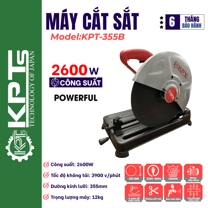 Máy cắt sắt KPTs KPT-355B 2600W là sản phẩm được sản xuất trên công nghệ hiện đại tích hợp với những tính năng ưu việt: thân máy chắc khoẻ, chân đế dày, mô tơ công suất lớn, không rung lắc, thân thiện với môi trường, đạt tiêu chuẩn an toàn khi sử dụng