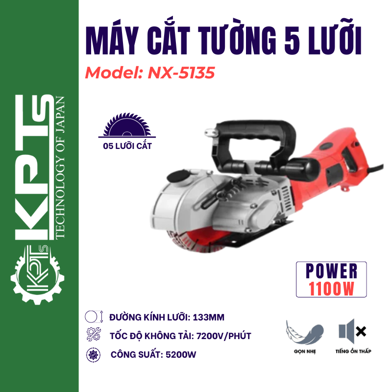 - Máy cắt tường 5 lưỡi NX-5135 với công suất lên đến 5200W mang lại hiệu suất làm việc cao, vận hành ổn định. Phay gạch đỏ đặc, phay đá cứng, phay bêtông cốt thép, phay đứt cả sắt xây dựng