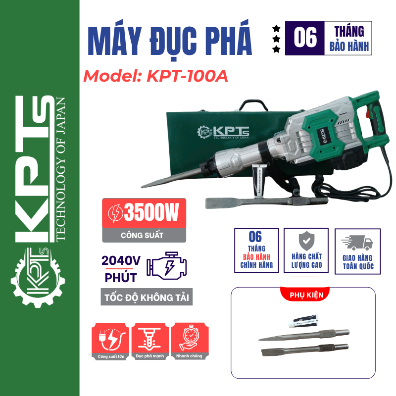 Máy Đục Phá KPTs KPT-100A là máy đục phá bê tông. sở hữu khả năng làm việc vô cùng mạnh mẽ với công suất 3500W. Đây là lựa chọn hoàn hảo để người dùng có thể đục khoét các tấm bê tông cứng, vật liệu cứng. Máy công cụ cầm tay này được sản xuất trên dây chuyền công nghệ tiên tiến của Nhật Bản nên