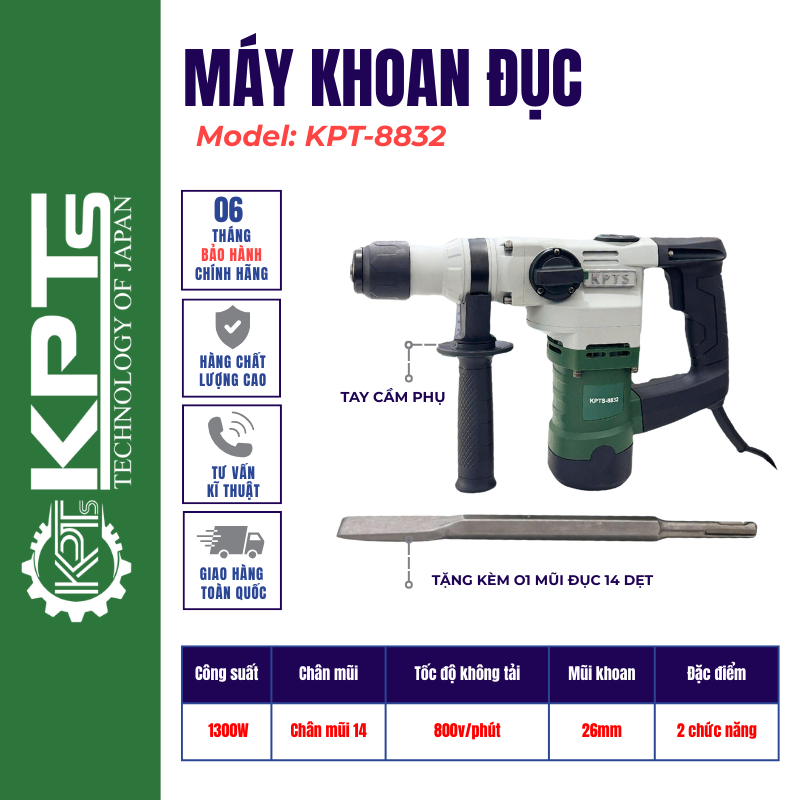 Máy khoan đục bê tông 2 chức năng KPT-8832 là dòng máy khoan đục mạnh mẽ nhất hiện nay với công suất lên đến 1300W có thể làm hài lòng những người thợ khó tính nhất.