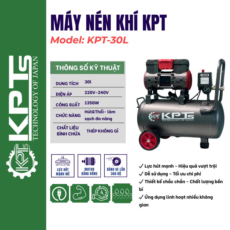 MÁY NÉN KHÍ KHÔNG DẦU KPT-NK30L (30 LÍT) SIÊU ÊM – SIÊU SẠCH – SIÊU BỀN